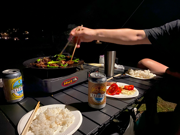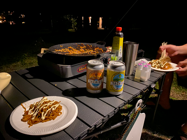 なんとか設営を1時間以内に終わらせ、超特急で道の駅での買い出しも終えた。
